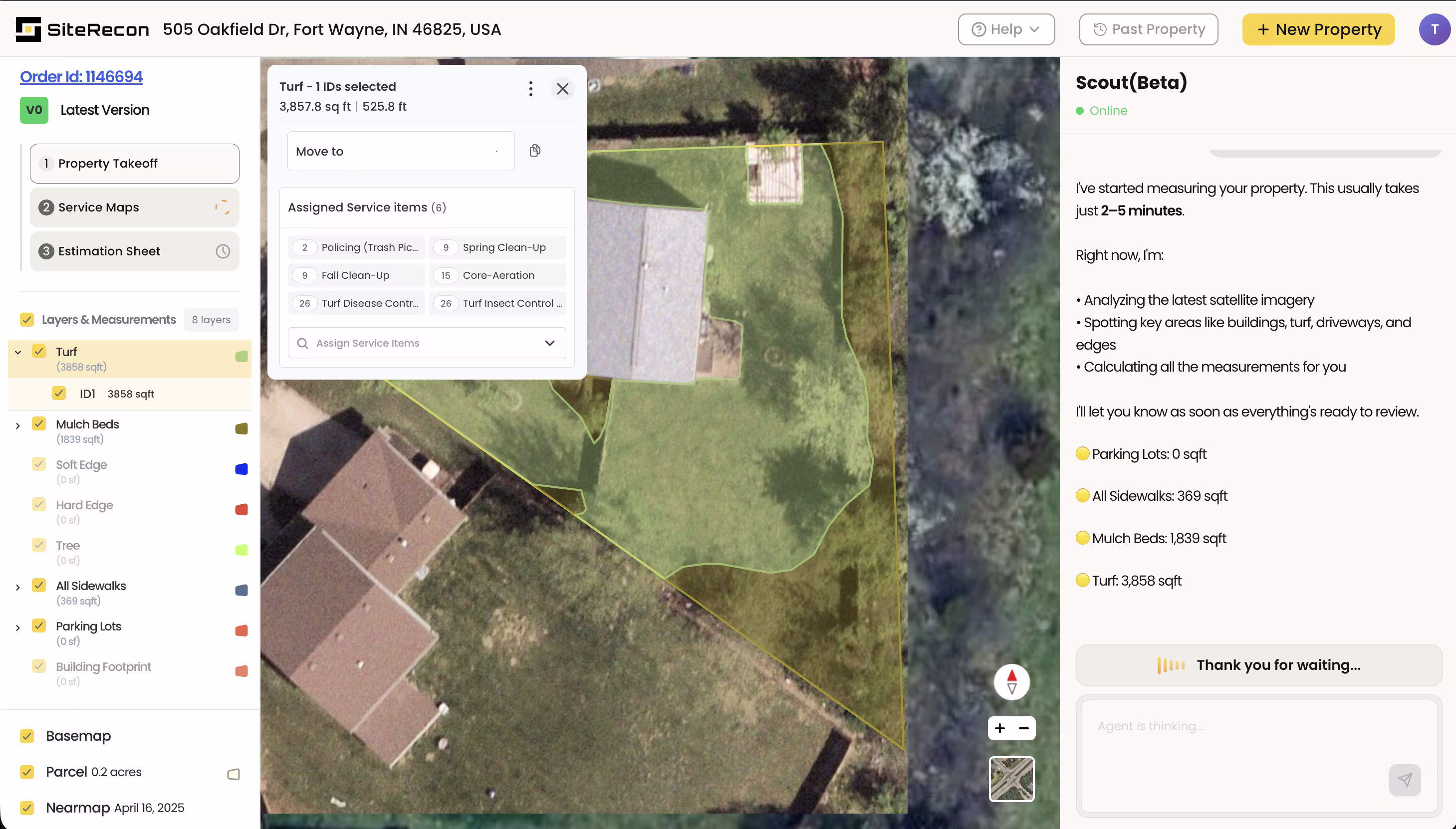 Instant Property Intelligence: The AI analyzes addresses and delivers comprehensive measurements within seconds—parking lots, sidewalks, building perimeters, landscape zones, all automatically identified and calculated. No manual tracing, no imagery uploads, no waiting for processing.